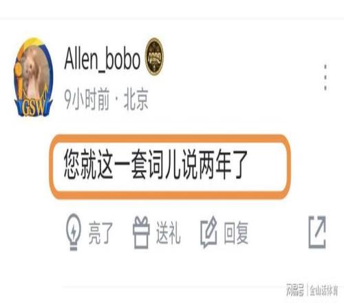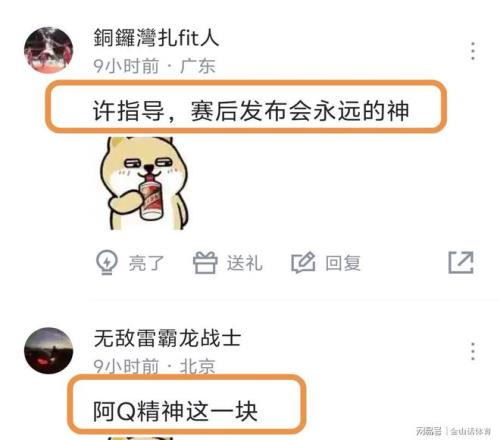 对于许利民的赛后总结,网友们也是纷纷吐槽。“您就这一套词儿说两年了”;“没看到希望,只看到了绝望。”;“许指导,赛后发布会永远的神”;“阿Q情神这块”;“你是真固执。第三节那个阵容你是真敢安排。”;“永远充满希望,永远热泪盈眶,永远豪情满怀,永远坦坦荡荡。”;“又是精神胜利,经典发布会逆转”……